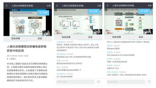 本次沙龙还设立了线上直播间,面向全国更多的肿瘤免疫研究者同步直播,也获得线上用的踊跃参与并提出了非常多的科学性问题。 来自艾德摩生物的彭思颖博士和上海南方模式生物的孙瑞林博士分别针对线上用户提出的问题进行了一一解答,反响热烈。